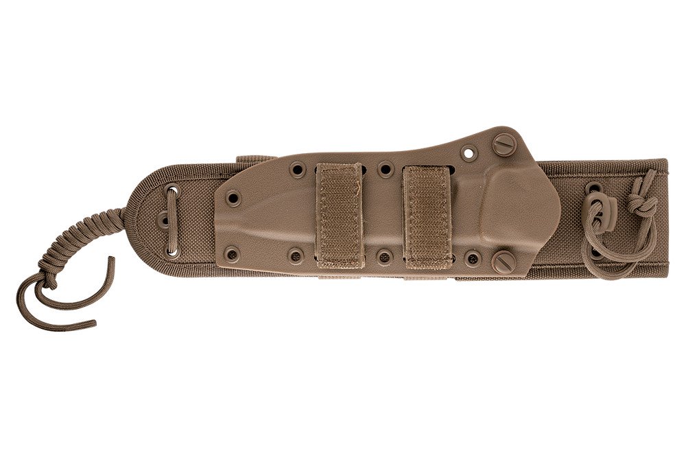 Handle: Attached to the full tang of the blade with coated stainless steel hardware, the composite handle scales are contoured for comfort with milled texture for a secure grip in the most adverse conditions. A pronounced thumb ramp and forward finger choil delivers optimal control and help prevent sliding onto the blade during heavy use. The exposed pommel of the blade can be used for striking or prying and is milled with a hole for lanyard attachment.