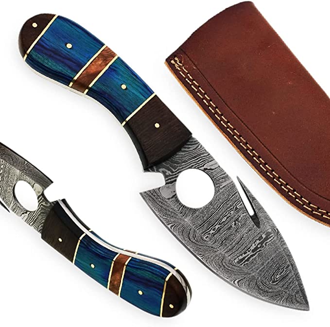 9" Handmade Skinning Gut Hook Damascus Steel Hunting Knife. Color full Wood Handle with Suede Leather Sheath,