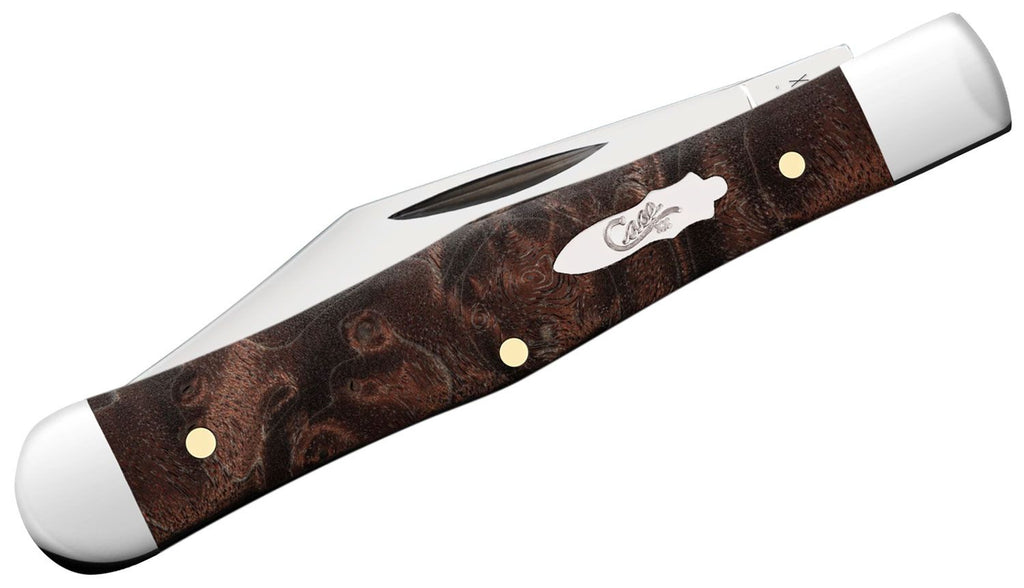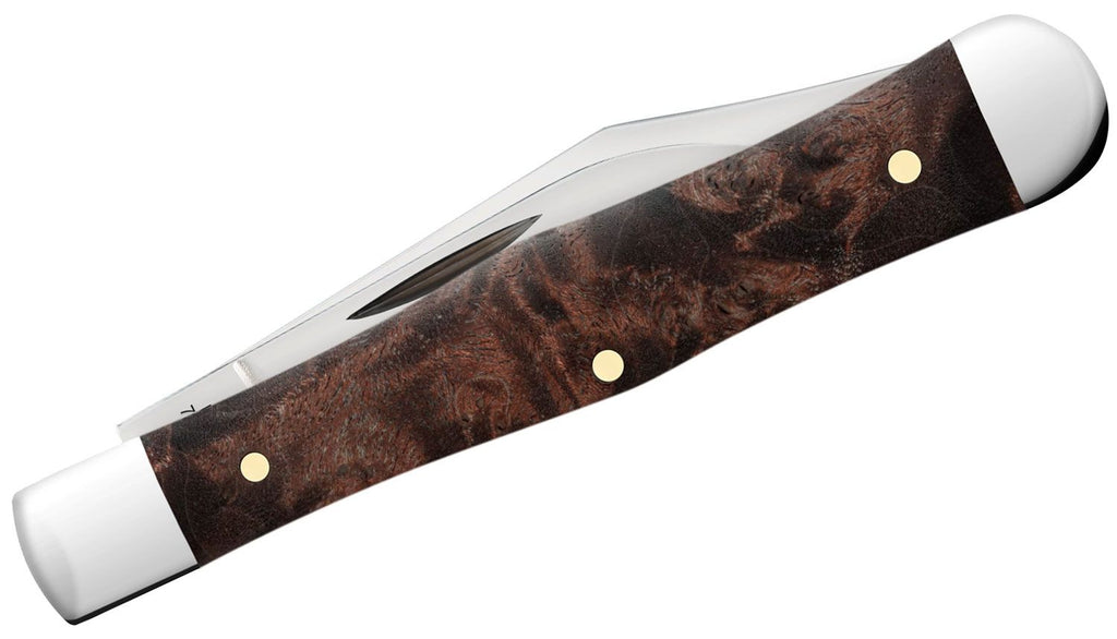 The deep, rich color of the Brown Maple Burl Wood family of knives pairs with its nickel silver bolsters and Case arrowhead shield to create a classic and classy look that fits Case's traditional style. The Case Small Swell Center Jack (’25-1/2) has returned for 2022, placed prominently in the spotlight of Case’s popular XX Vault program. Crafted by Case artisans as early as the 1940s, the Small Swell Center Jack was a common companion for workers on the factory floor or out on the farm. Today this handy knife, at just 3 inches in closed length and weighing in at a mere 1.7 ounces, remains a fan favorite, with its antique soda bottle shape and multi-purposed Clip and Pen blades.