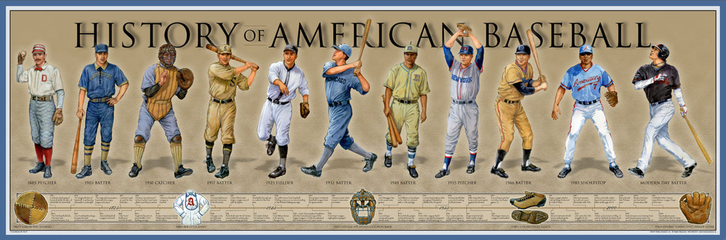 Celebrate America's Past time, from the 1800's to modern day. Players from left to right include: 1885 Pitcher, 1903 Batter, 1910 Catcher, 1917 Batter, 1925 Fielder, 1932 Batter, 1941 Batter, 1955 Pitcher, 1966 Batter, 1985 Shortstop, Modern Day Batter. The 47 point time-line includes dates, facts and 5 vintage pieces of equipment.