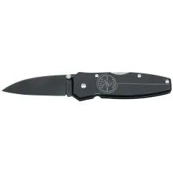 Klein Tools Black Lightweight Lockback Knife, 2-1/4'' Drop Point Blade is AUS8 stainless hardened to 58-59 Rc. Premium quality blade offers superior edge holding. Black chrome blade and black anodized-aluminum handle for corrosion resistance. Slim and comfortable silver anodized-aluminum handle for corrosion-resistance. Reversible thumb stud provides easy one-handed opening.