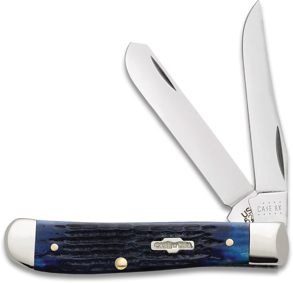 Handcrafted in the U.S.A., this classic American Case Mini Trapper is about 3 1/2 inches long (folded/closed) and weighs approximately 2.6 ounces. The handle is jigged Navy Blue Bone with a Chevron Nickel Silver Case USA Inlay shield. The bolsters are highly polished Nickel Silver. This knife utilizes a 2 3/4" Clip blade and 2 3/4" Spey blade. Stamped with pattern number 6207 SS, the blade material is Tru-Sharp Surgical Stainless Steel. This Mini Trapper is a professional-grade tool that comes with a Limited Lifetime Manufacturer's Warranty and is not designed nor intended to be used on or against humans. So, whether you're hunting for authentic cutlery to collect, a top quality knife to give as a gift, or a superior tool to use