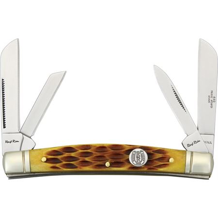 Model - RR053. Rough Rider 053 - Congress Folding Pocket Knife with Jigged Bone Handle. 3.63" closed. Stainless twin sheepsfoot, pen, and coping blades. Amber jigged bone handle. Nickel silver bolster(s). Inlay shield. Boxed