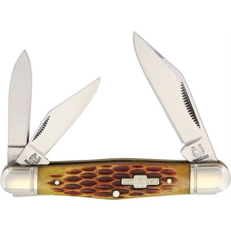 Model - RR106. Rough Rider 106 - Whittler Folding Pocket Knife with Amber Bone Handle. 3.5" closed. Stainless clip, short clip, and pen blades. Amber jigged bone handle. Nickel silver bolster(s). Inlay shield. Boxed.