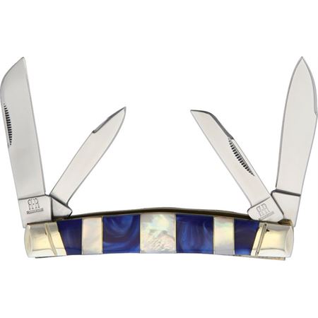 Model - RR2022. Rough Rider 2022 - Blue Ocean Large Congress. Blue Ocean Series. 4.13" (10.49cm) closed. Mirror finish stainless coping, sheepsfoot, pen, and spear blades. Nickel silver bolster(s). Blue acrylic and white mother of pearl handle. Boxed