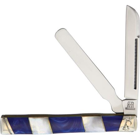 Model - RR2023. Rough Rider 2023 - Blue Ocean Doctors Knife. Blue Ocean Series. 3.75" (9.53cm) closed. Mirror finish sheepsfoot and spatula blades. Nickel silver bolster(s). Blue acrylic and white mother of pearl handle. Boxed.