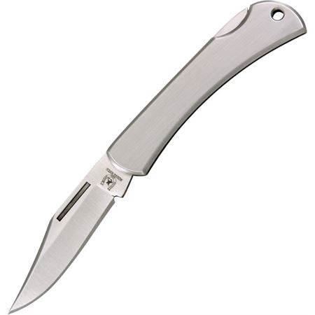 Model - RR998. Rough Rider 998 - Stainless Lockback Knife. 3.38" closed. 2.63" 440 stainless clip point blade. Brushed stainless handle. Lanyard hole. Boxed