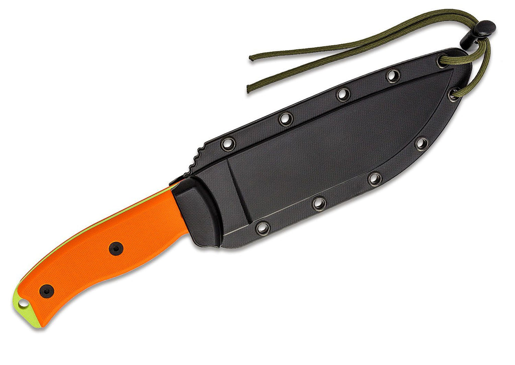 The ESEE-6 is a wilderness survival and tactical knife that might just be the best all-around fixed blade on the market. With its 0.1875" blade thickness, it's the perfect blend between toughness and cutting efficiency all in a very svelte package. If you can only choose one fixed blade, then the ESEE-6 is the one for us! These knives are made from high carbon 1095 steel. And while 1095 is a top choice for professional cutlery designed for hard use, it will rust and stain if not properly cared for - especially on the cutting edge and around the laser engraving. It is the user's responsibility to keep the blades properly lubricated and cleaned. We suggest using a dry film rust inhibitor such as TUF-GLIDE or TUF-CLOTH. The handles have orange G10 scales that are durable and water resistant. The knife also features spine jimping, full tang construction, lanyard hole, and finger choil. The knife comes with a molded plastic sheath, clip plate, paracord lanyard, and cord lock.